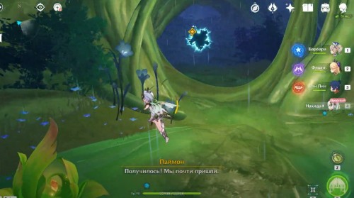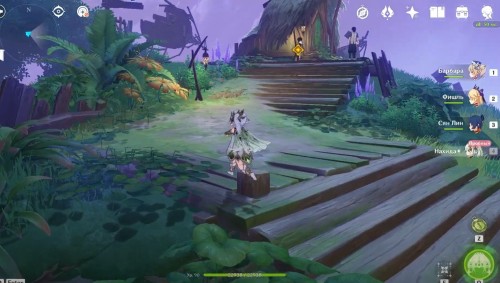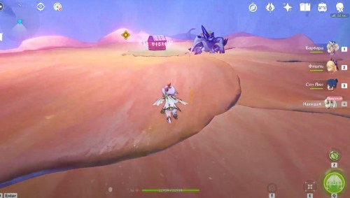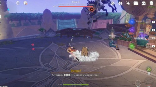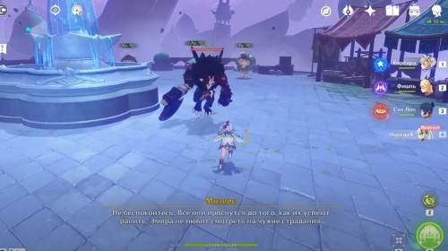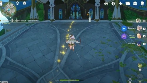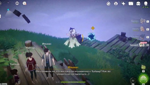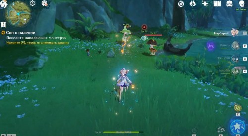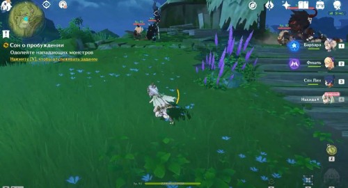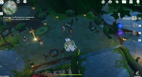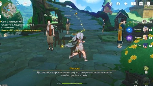 Поднявшись, снова гляньте короткую кат-сцену, а затем вступите в схватку с хиличурлами и митачурлом (вам дадут поиграть за Нахиду). Они не должны вызывать у вас особых проблем. Расправившись с ними, возвратитесь в столицу на Мгновение сновидений. Снова пообщайтесь с людьми.