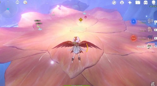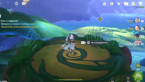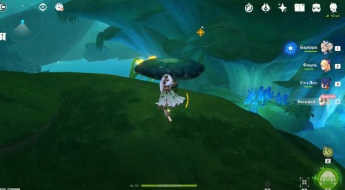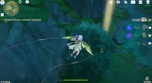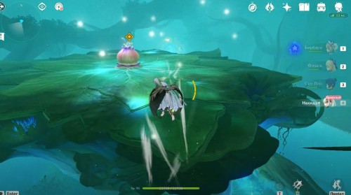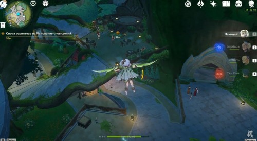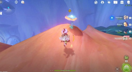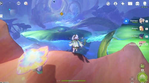 Оказавшись во сне, вы сможете взять под управление Нахиду, даже если ее нет в вашей команде. Вначале подойдите к синему грибовидному цветку, отмеченному маркером, и взаимодействуйте с ним, чтобы создать призрачный мост и воздушный поток. Воспользуйтесь последним и приземлитесь на огромный красный бутон с плесенниками.