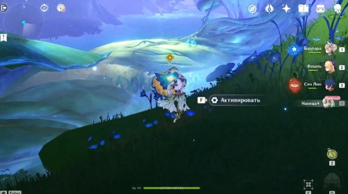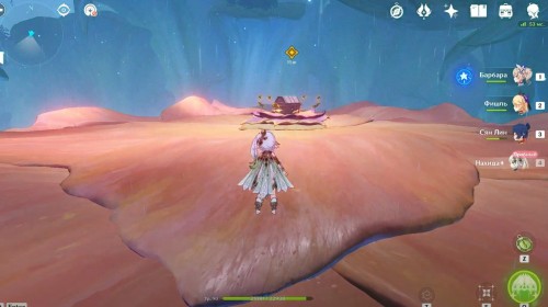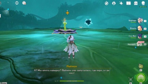 Попав в новую область, пройдите на парящую платформу и активируйте ее, чтобы подняться на огромный цветок. Там разберитесь с одним вишапом глубин для разблокировки сундука и появления портала, ведущего на другую платформу, где на вас тут же нападут митачурлы и хиличурлы.