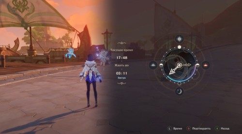 Расправившись с оппонентом, покиньте арену и поболтайте с Яэ Мико. К разговору также присоединится Лайла. После завершения беседы прокрутите время на раннее утро следующего дня (03:00-05:00) с помощью меню Паймон. Затем двигайтесь к киоску с цветочным агаром, расположенным в этом же портовом городке.