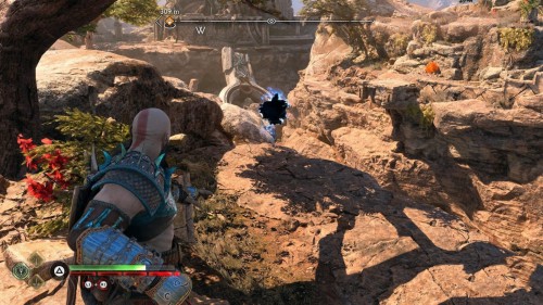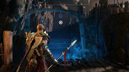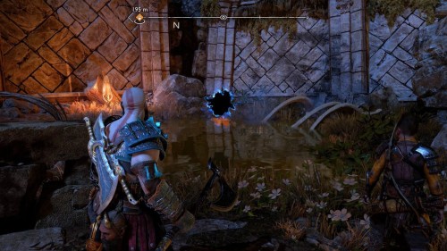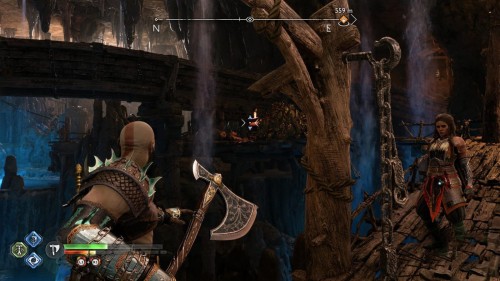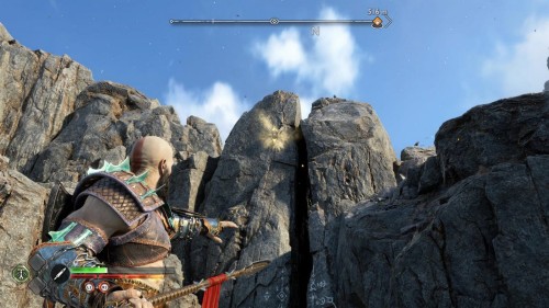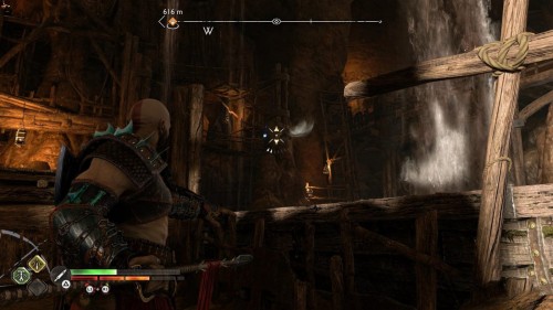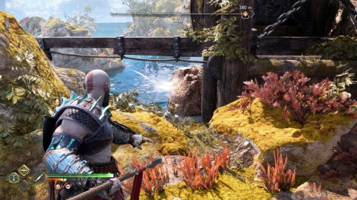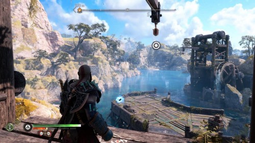 Поднявшись, снова примените копье, но теперь для уничтожения камней с левой стороны от разрушенного моста. В результате вода поднимет нужную вам точку захвата, используя которую вы сможете добраться до площадки с разломом Иггдрасиля.