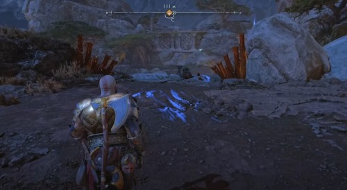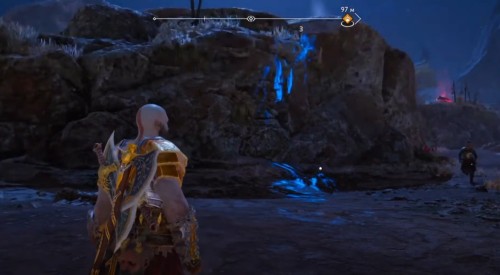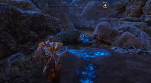 Здесь все довольно просто – вам нужно лишь следовать за синими следами на земле. Для этого встаньте лицом к скале, на котором вы обнаружили первые пятна, а потом идите налево и сверните вправо. Бегите вдоль обрыва направо, а потом спуститесь с выступа вниз.