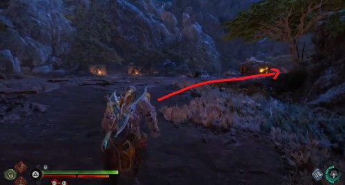 Затем в ночное время суток (иначе вы не сможете потом выследить монстра) пройдите на левый берег Равнин в его западную часть. Там отыщите синие следы на скале (точное место показано на скриншотах ниже) и осмотрите их. После этого вам тут же выдадут необходимое задание.