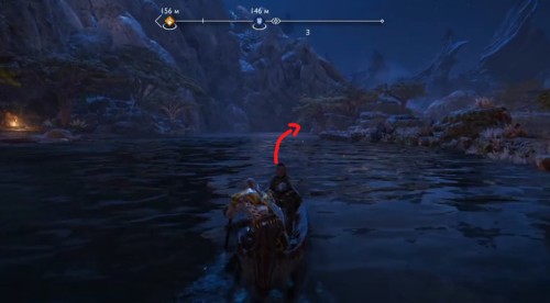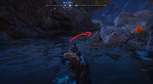 Продолжайте идти за синими следами и подойдите к камню впереди – взаимодействуйте с ним. Вы обнаружите логово ящера, однако отсюда попасть в него не удастся, поэтому развернитесь и бегите к ближайшему причалу. Сядьте в лодку и плывите на запад. Причальте возле берега с синим пятном.