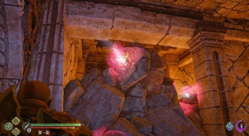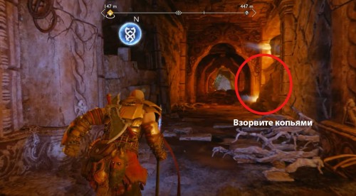 Слева разрушится стена, и на вас нападет драугр. Справа при этом находится куча камней с тремя желтыми точками – выстрелите в них копьями, а потом взорвите, чтобы расчистить себе путь. Далее разберитесь с очередными драуграми.