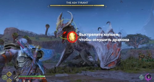 Спустя некоторое время Пепельный тиран взлетит, а затем сядет на одну из колонн, призвав себе на помощь виверн и драугров. Разберитесь со всеми рядовыми мобами (огонь дракона тоже наносит им урон), а потом киньте копье в желтую точку на каменном столбе, где сидит дракон. Колонна разрушится, и враг снова спустится на землю.