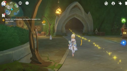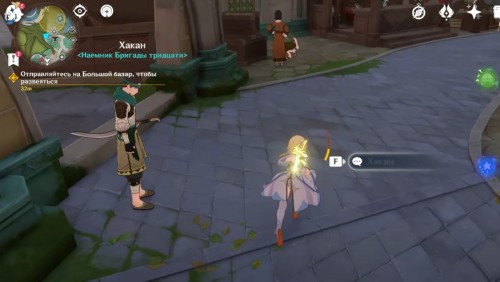 Когда вам вернется контроль над героем, сразу же проследуйте за Скарамуччей – для этого двигайтесь вслед за маркером и выйдите из базара наружу. Вы обнаружите нужного персонажа возле выхода из города. Вступите с ним в диалог.