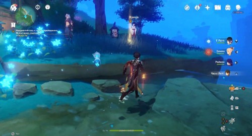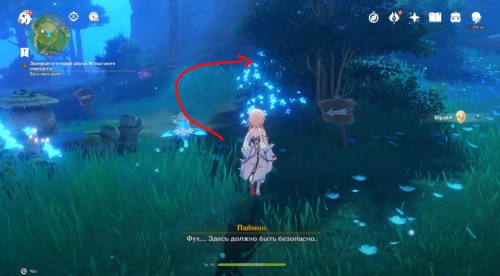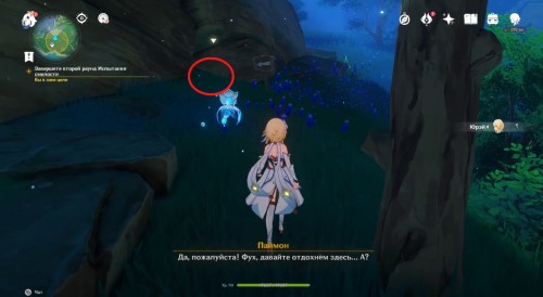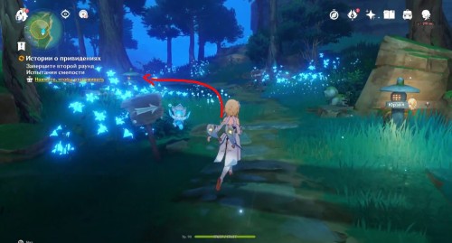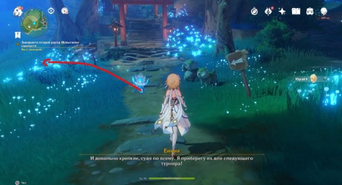 Переместитесь в лес Тиндзю и справа от арки отыщите Аратаки Итто. Поболтайте с ним, а потом обратитесь к работнице, изъявив желание поучаствовать во втором испытании смелости. Она скажет, что вам снова нужно будет выбрать напарника для участия в состязании.