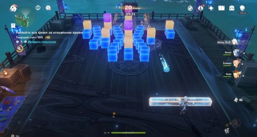 Вначале переключитесь на Крио героя (сделайте это дважды для расширения платформы), а потом быстренько уничтожьте Гидро блоки. В конце можете взять Пиро героя для разрушения оставшихся обычных и Электро кубов.