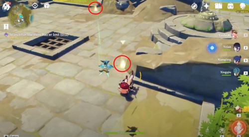 После разговора с девушкой отправляйтесь в руины, расположенные на юге. Для этого просто воспользуйтесь ближайшим телепортом, а затем спланируйте вниз к отмеченной области. Внизу осмотрите 2 подсвеченные точки.