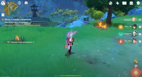 Добравшись до берега, вы столкнетесь с четырьмя похитителями сокровищ – это рядовые мобы, с которыми можно без проблем справиться даже с непрокаченными персонажами. Для удобства можете сгруппировать их в кучу, используя Анемо бойца, а потом добить взрывом стихий. Разобравшись с противниками, вы получите Украденную реликвию.
