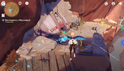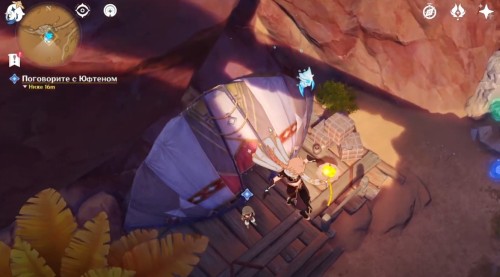 Далее поболтайте с Массейром, который находится еще ниже, неподалеку от подвесного моста и еще одной юрты. Он более-менее тепло поприветствует Путешественника. В конце необходимо пообщаться с Юфтеном, которого вы можете найти на самом дне ущелья, рядом с рекой и крокодилами.