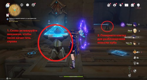 Первым делом вам нужно будет активировать таинственный механизм в левой части зала, что приведет к появлению потока песка слева. Затем поверните ближайшую клетку в сторону призмы для открытия двери.