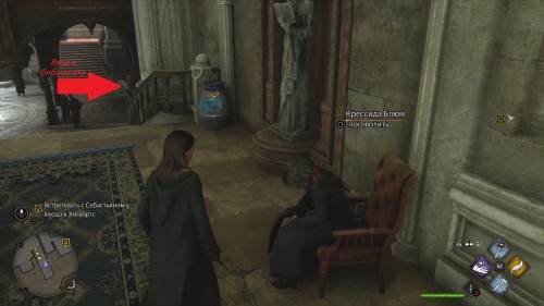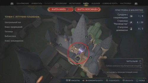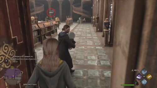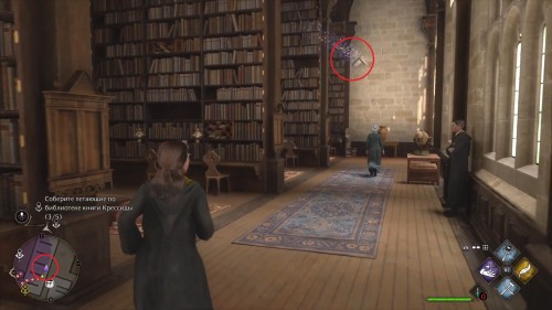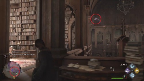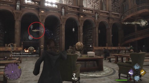 Спуститесь с помоста и поверните направо, в библиотечный зал. Первые две книги можно поймать сразу, как только откроете дверь в помещение: одна из них парит прямо напротив входа, вторая в центре комнаты над столами. Используйте заклинание «Ревелио» для подсветки целей, а следом за ним «Акцио» – чтобы притянуть предмет, находящийся на расстоянии.