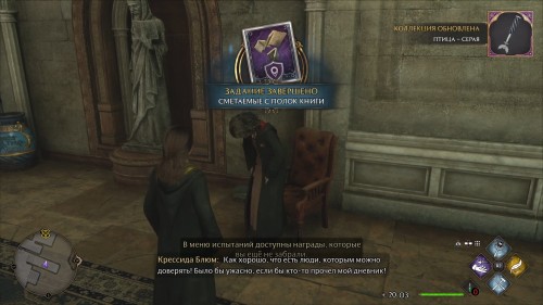 Пробегитесь по периметру нижнего зала библиотеки, снова используя чары поиска. Следующий фолиант летает в закутке за винтовой лестницей, возле точки с летучим пламенем. Кстати, этой книгой окажется упорхнувший дневник мисс Блюм, и сейчас вам представится возможность заглянуть в него.