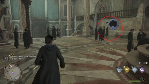 Все очень просто: из зала с черной картиной вниз к выходам ведут две широкие лестницы, вам нужна дальняя (от того места, где началось задание). Просто спуститесь по ступенькам и поверните налево, в закуток с весьма заметной статуей.