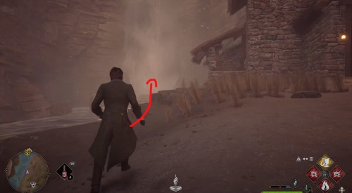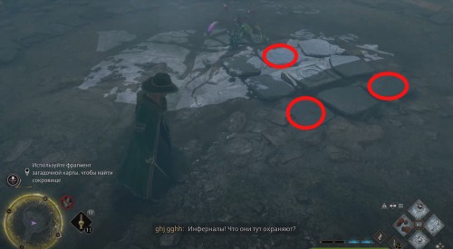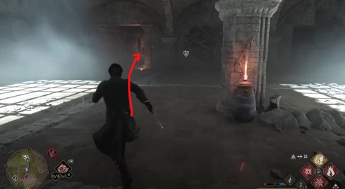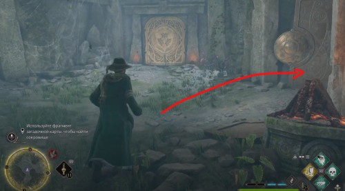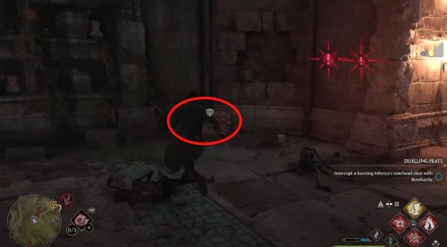 Открыв дверь, пройдите дальше и разберитесь с очередными инферналами. Здесь вы обнаружите на земле плиты с символами. Вам необходимо будет применить Флиппендо (можно изучить при прохождении квеста «Задача профессора Чесноук 2») на камнях, показанных на скриншоте ниже.