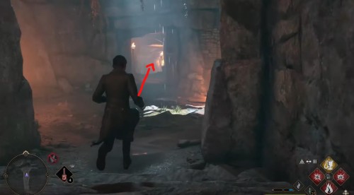 Добравшись до водопада, сядьте на метлу и пролетите прямо через него, чтобы оказаться возле входа в крипту. Войдите внутрь и бегите вниз по туннелю. Когда окажитесь на развилке, продолжайте двигаться вперед, никуда не сворачивая. На второй развилке сверните вправо, чтобы попасть в помещение с открытым каменным гробом. Испепелите паутину слева с помощью заклинания и пройдите через открывшийся проход.