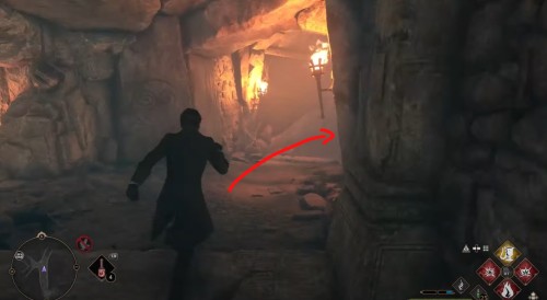 Войдя в небольшое помещение, вы увидите впереди золотую дверь с тремя выемками для мотыльков. Сначала разберитесь с парочкой пауков 27-го уровня, а затем сверните в открытую дверь справа. Тут вы обнаружите сразу двух необходимых вам насекомых. Подойдите к любому из них и используйте Люмос, чтобы он начал следовать за вами – доведите его до закрытых дверей. Сделайте тоже самое со вторым мотылем.