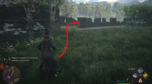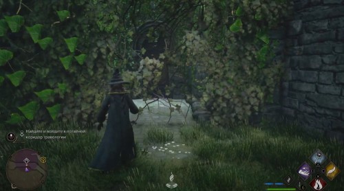 Начните следовать за указателем квеста, который приведет вас в школьный сад. Если вы пришли в отмеченную область, но не видите никакого прохода, то вам просто нужно спуститься вниз по лестнице (смотрите первый скриншот ниже). На нижнем уровне вы обнаружите проход, который зарос лианами. Для удаления преграды воспользуйтесь заклинанием Инсендио. Затем просто пройдите через дверь.
