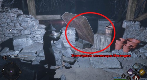 Теперь вернитесь в основной коридор и продолжайте двигаться вперед по прямому пути, а затем слева вы увидите проход. Пока что не идите в него. Вместо этого пройдите к баррикаде впереди и уничтожьте все эти ящики и доски с помощью Инсендио. Проплывите через воду, поднимитесь по ступенькам и откройте сундук, в котором вы найдете элемент экипировки. Возвратитесь назад и пробегите через левый проход.