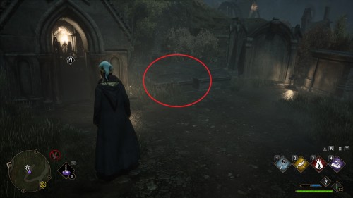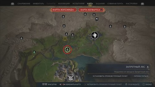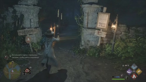 Взгляните на изображение: здесь мы видим лес, мрачный поселок и мост, который как-то связан с чарами «Люмус» и парящими свечами. Используйте точку перемещения у входа в запретный лес или доберитесь туда другим способом. Теперь вернитесь к началу моста, ведущего в Хогсмид.