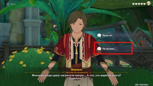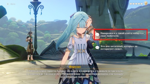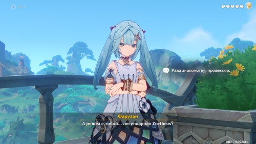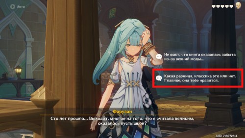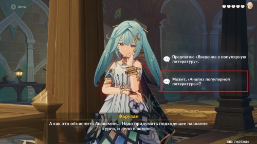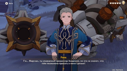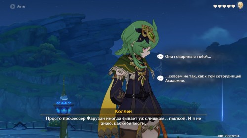 Далее направляйтесь в Академию, находящуюся в столице Дендро региона. После телепортации к восточной точке быстрого перемещения сразу же начнется кат-сцена с участием Фарузан. Поговорите с профессором. Опять же можете выбирать любые ответы.