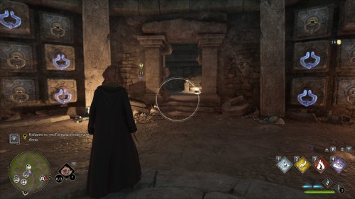Войдя в пещеру, используйте заклинание «Ревелио», чтобы увидеть нужные ячейки. Примените к ним «Акцио». Порядок не имеет значения, но если вы ошибетесь и потянете неверную «ручку» — придется повторить все сначала.