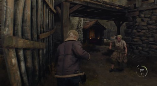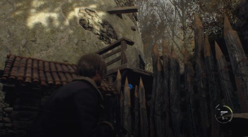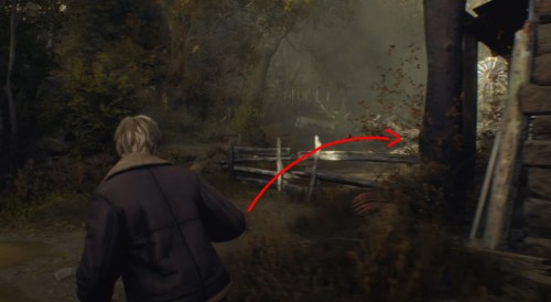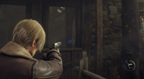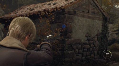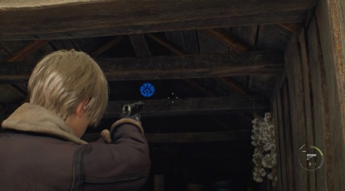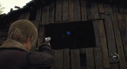 Забрав записку, развернитесь, выйдите через проход, а затем поверните камеру вверх и налево. На втором этаже большого амбара вы увидите окошко, в котором виднеется синий медальон – выстрелите в него.