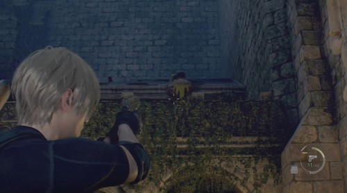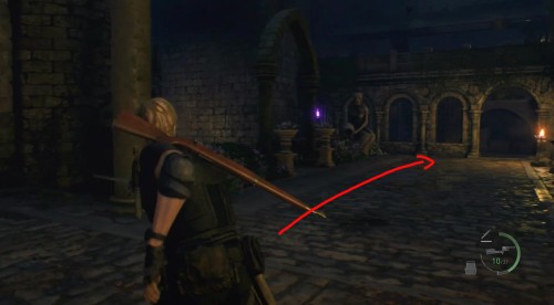 Встаньте перед каменной террасой, поднимите камеру наверх, и вы обнаружите на крыше воронье гнездо. Прицельтесь в него и сделайте выстрел. В результате на землю упадет поцарапанный изумруд, который вы сможете подобрать (он будет лежать возле тюка впереди).