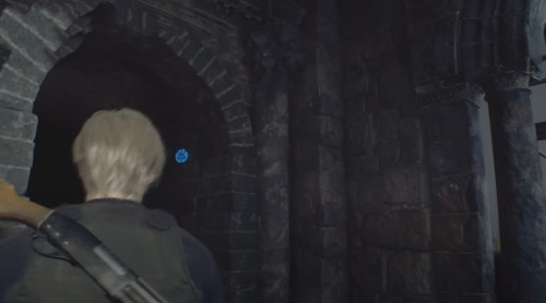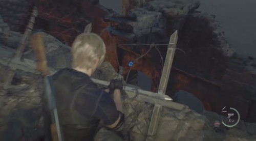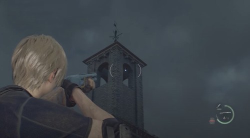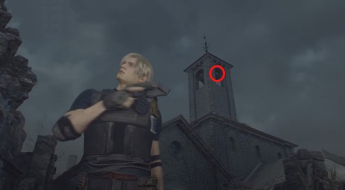 Развернитесь, сделайте несколько шагов, а потом снова повернитесь на 180 градусов и поднимите камеру высоко вверх. Вы увидите в колокольной башне синий талисман. Воспользуйтесь винтовкой с оптическим прицелом, чтобы без проблем сломать его (может также сработать дробовик, главное прицелиться в центр медальона).