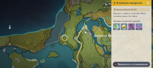 Отправляйтесь к юго-восточной части озера. Спуститесь по лестнице у деревянного дома. Отец малыша направится к обрыву, но его остановит Ху Тао. Девушка распознает симптомы болезни: в теле больного Цзя Ляна действуют останки злого божества, и скоро они могут выйти из-под контроля. Вместе вы отведете мужчину в хижину «Бубу».