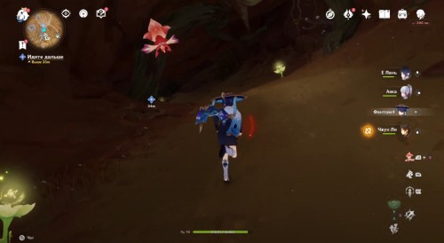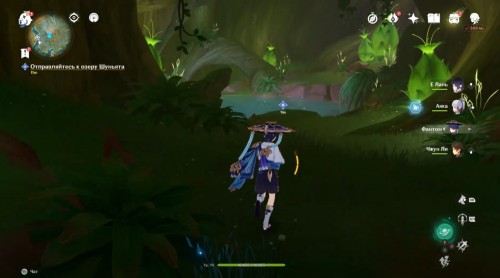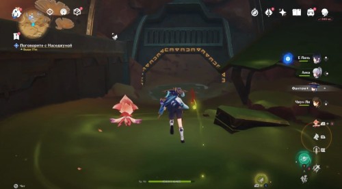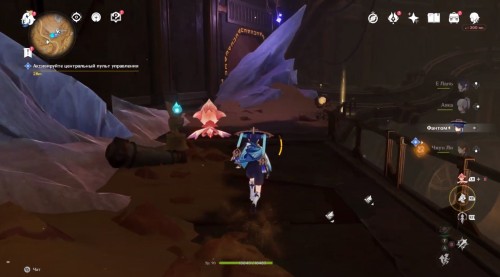 Расправьтесь с группой хиличурлов и митачурлом, чтобы разблокировать богатый сундук и консоль в виде шара, открывающую решетку на полу. Спрыгните вниз, чтобы попасть в наполовину затопленное помещение. Нужное ядро будет лежать на дне водоема. Взаимодействуйте с механизмом на другой стороне, чтобы слить воду и забрать зеленую сферу.