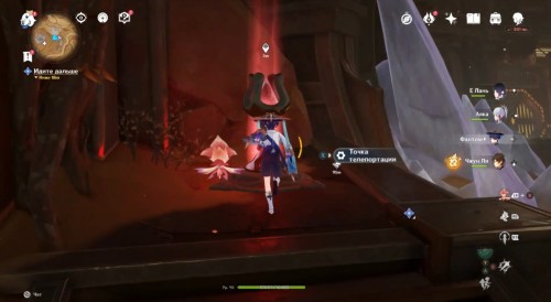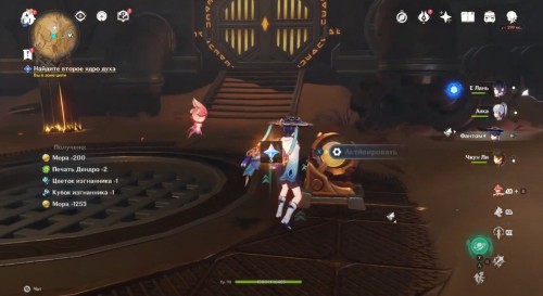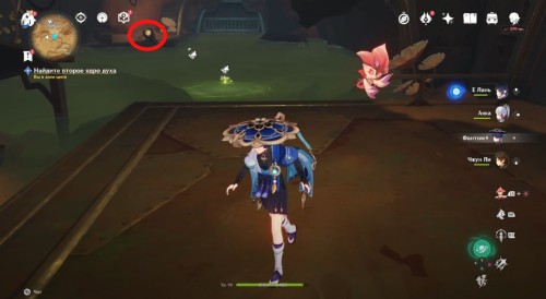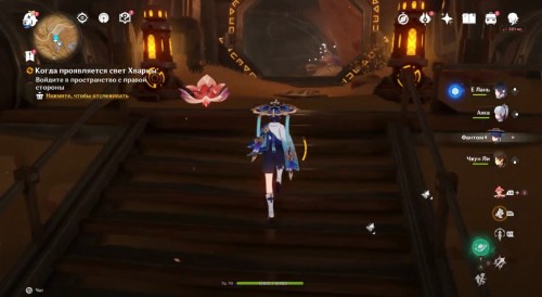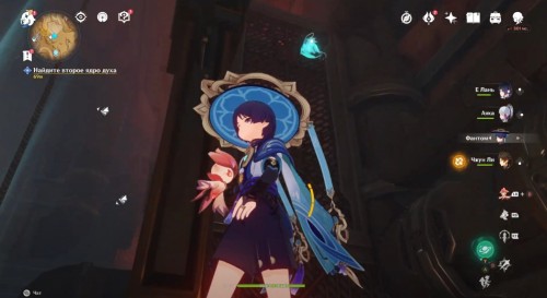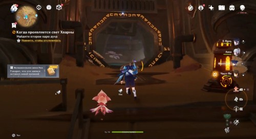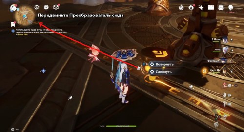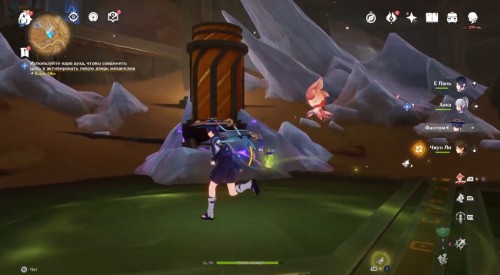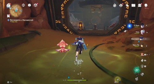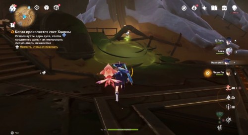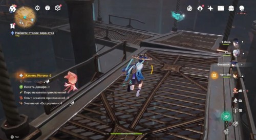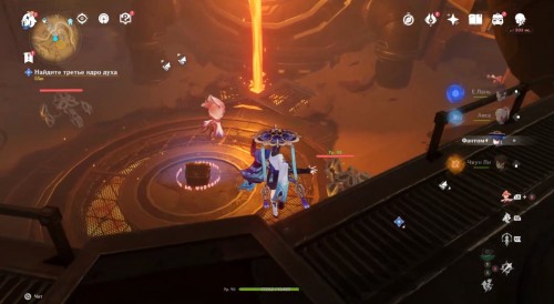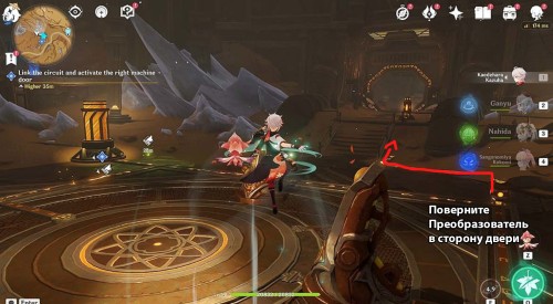 Настроив все как нужно, снова пообщайтесь с Наседжуной. Необходимое вам устройство расположено на верхнем уровне. Отыщите на краю помещения Анемо тотем и ударьте по нему воздушной атакой, чтобы создать поток воздуха – с помощью него поднимитесь на второй ярус.