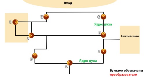 Для нахождения второго ядра отыщите вторую фею справа от решетчатой двери. Подойдите к ней и проследуйте в туннель. Двигайтесь до самого конца, и вы обнаружите здесь сферу. Возьмите ее и вернитесь в главный зал. Не забудьте открыть обычный сундук перед этим. Затем разместите духа между двумя преобразователями, показанными на картинке ниже.
