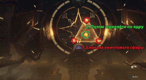 Если вы видите, что ядро защищено треугольным барьером, то вначале вам нужно будет снять его. Для этого выстрелите в три сферы на концах треугольника. Учитывайте, что на полет снаряда тоже тратится время, поэтому стрелять необходимо с небольшим опережением.