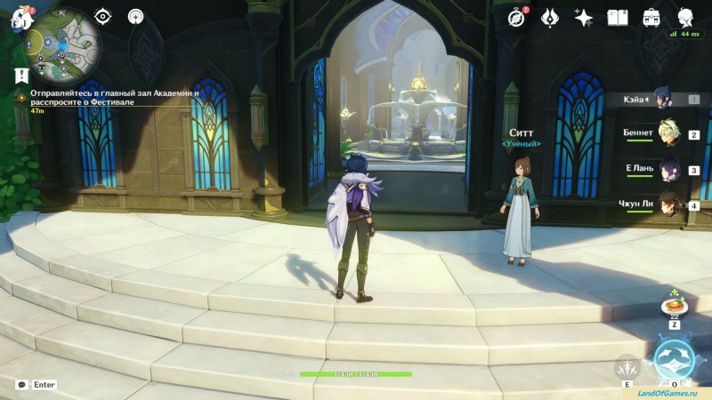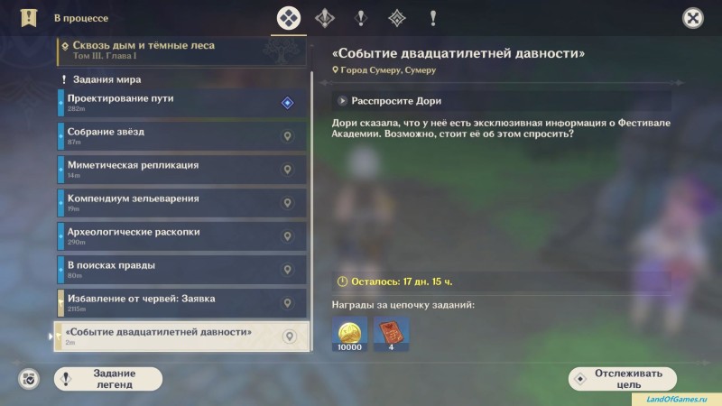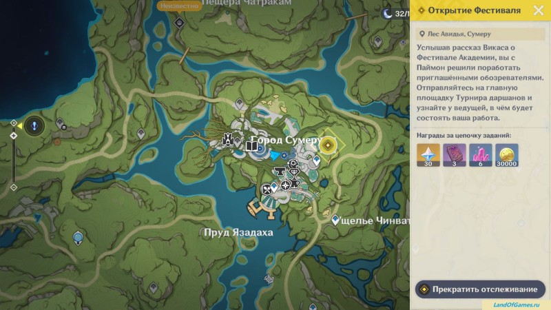 В Академию игрока отправит Паймон, каким-то образом разузнавшая о начинающемся в Сумеру фестивале. Поднимитесь наверх, в главный зал учебного заведения, где вы и встретитесь с организаторами события. Подробнее познакомившись с традициями этого праздника, путешественник получит также приглашение присоединиться к мероприятию в качестве наблюдателя.