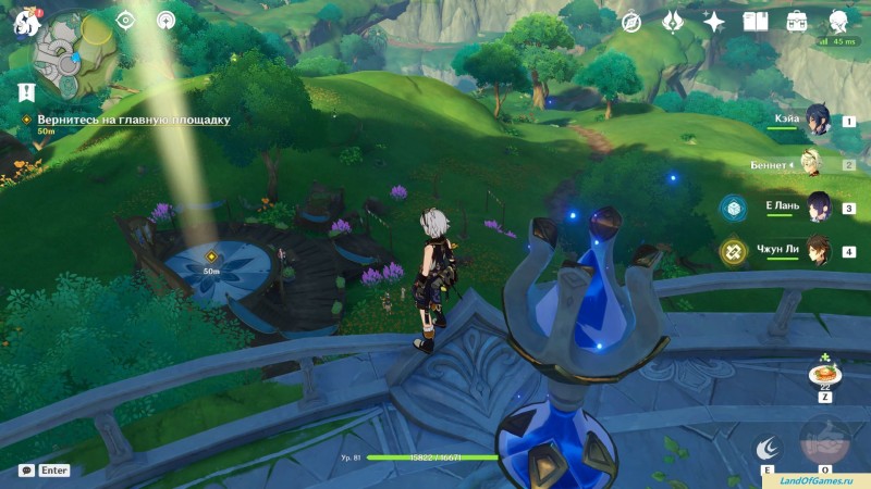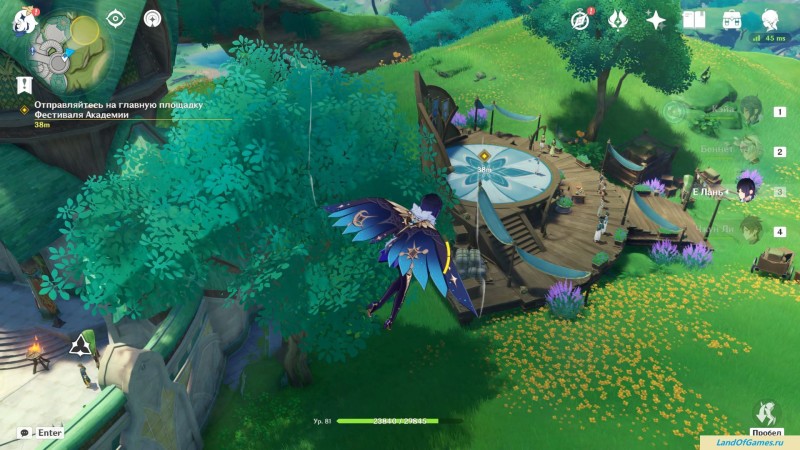 Откройте карту и посмотрите на иконки соревнующихся. Три точки возле портрета Лайлы намекают о необходимости проверить ее успехи в поимке стремительных бабочек. Воспользуйтесь восточной точкой телепортации и спланируйте вниз – девушка стоит на нижнем ярусе возле улицы сокровищ.