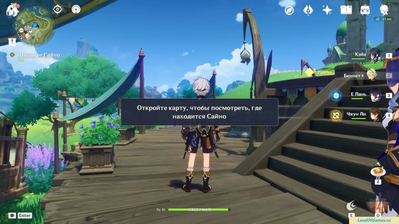 Благодарю локатору вы можете отслеживать местонахождение участников соревнования. Первым нужно найти Сайно, поэтому просто откройте карту и найдите иконку с его изображением. Ее также можно поставить на отслеживание, что упростит вашу задачу в разы. Теперь остается лишь воспользоваться ближайшим телепортом и приблизиться к цели.