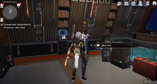 Внутри экспресса поговорите с Пом-Пом, который разблокирует вам Путеводитель межзвездного мира. Поговорите с ним еще раз, а потом отправляйтесь в жилой вагон. Там посетите каюты Дань Хэна и Март 7. Затем вернитесь назад и ждите прыжка. Будет открыта еще парочка дополнительных функций.