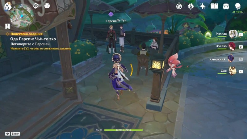 Как только необходимый дейлик выпадет, можно приступать к его выполнению. Найдите Гарсию в Сумеру, пользуясь маркером на карте. Он проводит время в компании Кайи и Лу Туна, наслаждаясь ароматным кофе, но не на секунду не забывает и о делах, сразу же подбирая для игрока очередное поручение.
