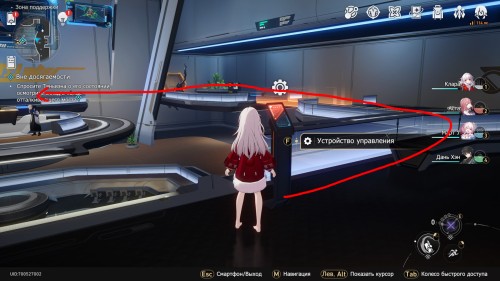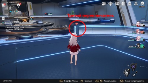Чтобы спросить Тяньвэна о его состоянии и осмотреть склад в конце отталкивающего моста, вам нужно будет взаимодействовать с устройствами управления в том же порядке, который показан на картинке выше. Далее мы продемонстрируем все консоли по отдельности. Итак, первым делом нажмите на панель, которая стоит прямо перед вами.