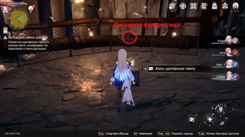 После прочтения записки пройдите в правый проход, возле которого висит шахтерская лампа. Вы окажитесь на небольшой площадке с фонарями. Подойдите к лампе, которая лежит на коробке, и возьмите ее. Затем подойдите к той части решетки, на которой нет источника света, и повесьте туда фонарь.