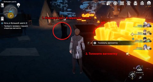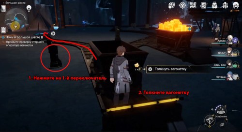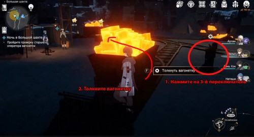 Снова взаимодействуйте с 1-м рычагом, а потом встаньте позади пустой вагонетки впритык и толкните ее к кристаллам. Загрузите в нее руду, а затем толкните обратно к другой тележке.