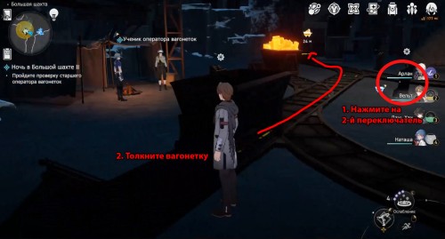 Возвратитесь к рычагу, на который вы ранее нажали, и снова взаимодействуйте с ним. Затем бегите к груженой тележке и толкните ее, чтобы поставить туда, где раньше стояла пустая вагонетка.