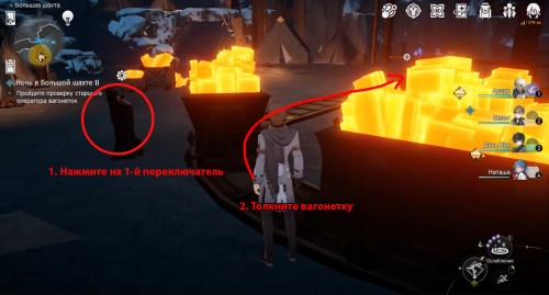 Нажмите на 1-й и 2-й переключатели, а потом толкните груженую тележку, чтобы перевести ее к обычному стопору. Снова взаимодействуйте со 2-м рычагом и толкните вагонетку с рудой, доведя ее прямиком к желтому стопору. На скриншоте ниже показаны все действия. Далее заберите награду и приступайте к следующей головоломке.