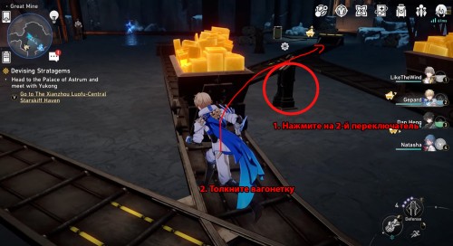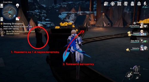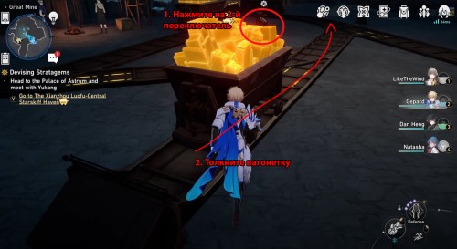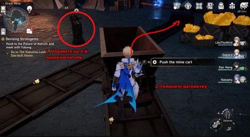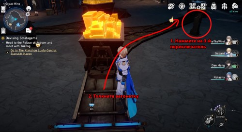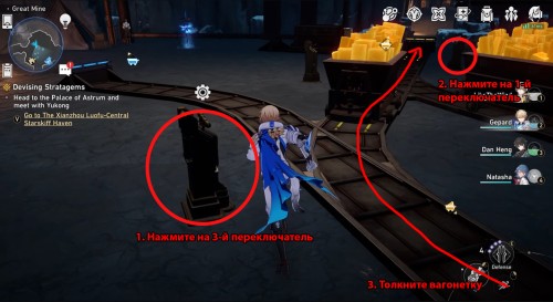 Нажмите на 3-й переключатель и толкните пустую вагонетку в другой конец. Потяните за 1-й рычаг и направьте тележку к зоне погрузки – положите в нее руду, а потом возвратите обратно к желтому стопору. На изображении ниже показаны все нужные действия.