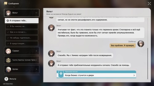 Определив источник сигнала, возвратитесь в Общий вагон и поговорите с Вельтом. Выберите первый вариант диалога, обозначенный восклицательным знаком. Во время беседы с Химеко и Янгом вам снова придет сообщение. Можете выбрать любой ответ.