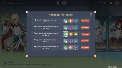 - Откройте 3 воспоминания о встрече: 100 очков приключений, 20 камней истока и 5 блюд «Амбициозный проект».