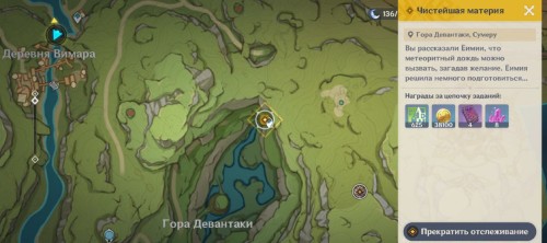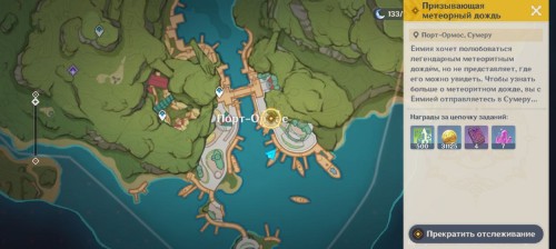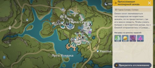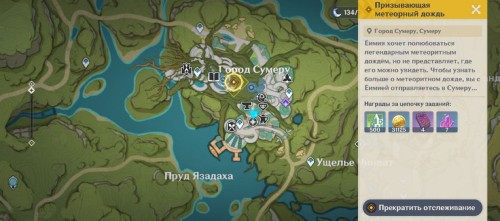 Телепортируйтесь к Ассоциации рыболовов Инадзумы и идите на восток, ко входу в город. Вы увидите, как отец Еимии провожает свою дочь в путешествие. Девушка поставила себе цель: увидеть самый большой метеоритный дождь в Тейвате. Вы предложите ей отправиться в Сумеру.